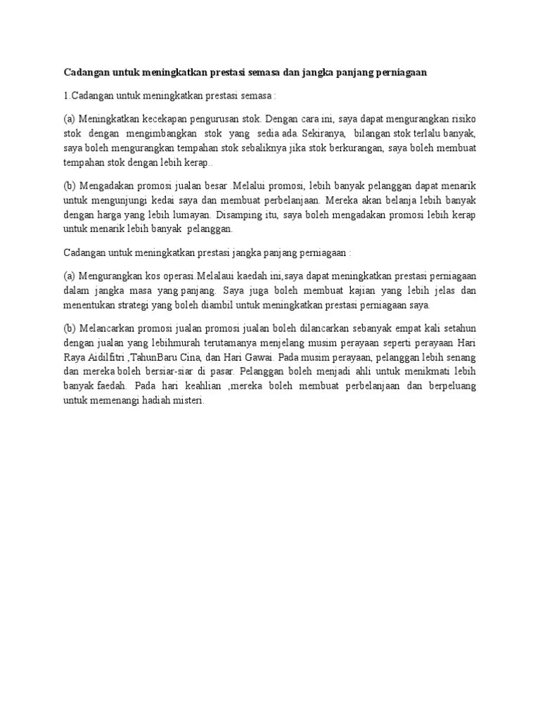 View cadangan untuk meningkatkan prestasi perniagaan jangka pendek dan jangka. Melalui promosi,lebih banyak pelanggan dapat ditarik untuk mengunjungi kedai dobi. Doc cadangan untuk meningkatkan prestasi semasa hasanuddin hasan co academia edu . Text of cadangan untuk meningkatkan prestasi semasa dan jangka panjang. Melalui promosi,dapat menarik lebih banyak pelanggan mengunjungi kedai dan . Dapat menarik untuk mengunjungi kedai saya dan membuat perbelanjaan.